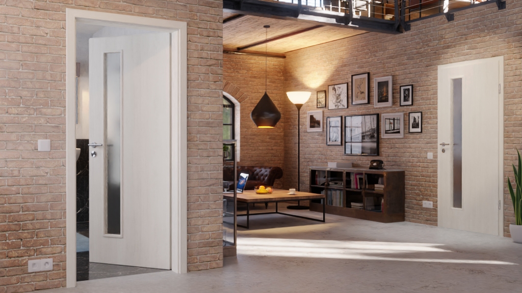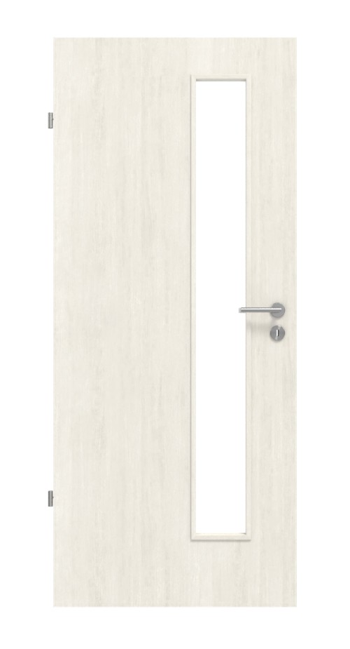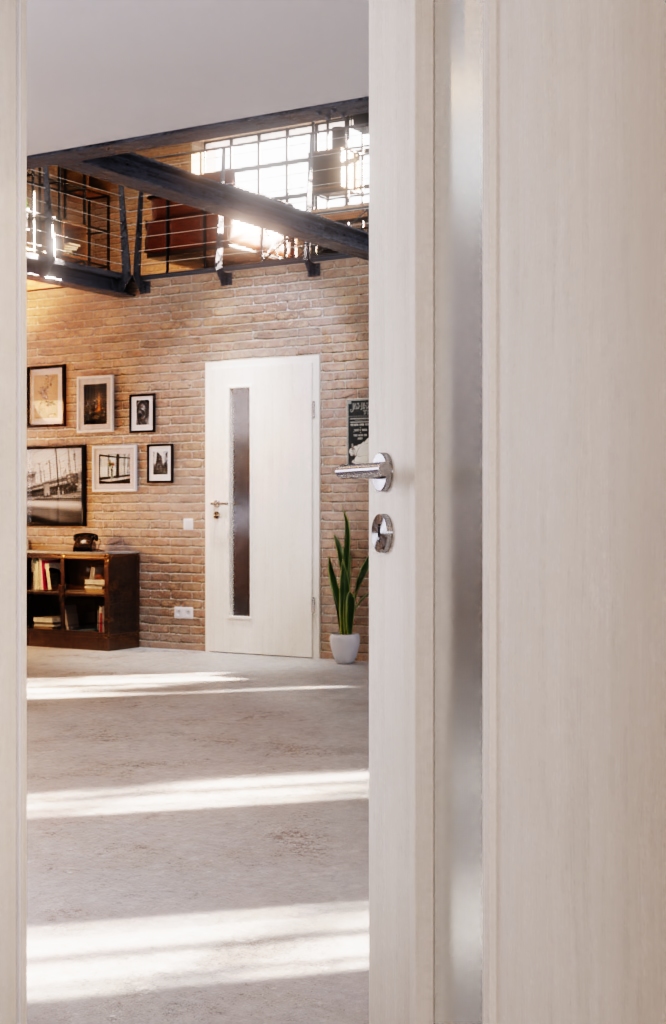 Otwór świetlny z nałożonymi listwami w kształcie prostokąta nadaje pomieszczeniu nowoczesny klimat. Jest wąski i znajduje się po stronie zamka drzwi. Dzięki wysokości umożliwia widok na drugą stronę drzwi oraz nadchodzące osoby. To przydatna funkcja w bardzo ruchliwych miejscach, takich jak biura czy kuchnie. Klamka i zamek również zyskują więcej światła.