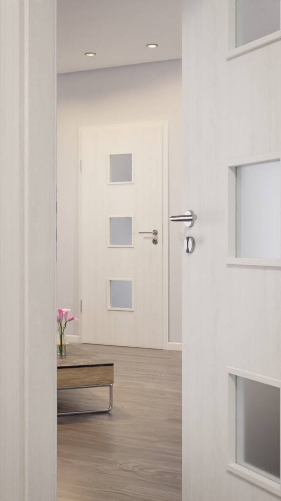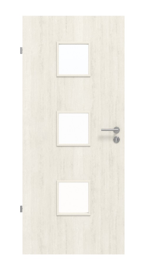 Trzy otwory szklane znajdują się jeden nad drugim w środku drzwi. Dzięki temu masz widok na drugą stronę i wpuszczasz światło do swojego pomieszczenia. Dolna część drzwi jest jednak chroniona przed uszkodzeniem szkła.