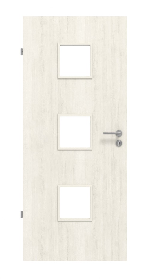 Otwór świetlny z nałożonymi listwami w kształcie prostokąta nadaje pomieszczeniu nowoczesny klimat. Trzy kwadratowe otwory świetlne w środku drzwi zachwycają wszechstronnością. Rozmieszczenie umożliwia trzy efekty: widok na zewnątrz, wystarczającą ilość światła oraz chroniony dolny obszar drzwi przed uszkodzeniami.
