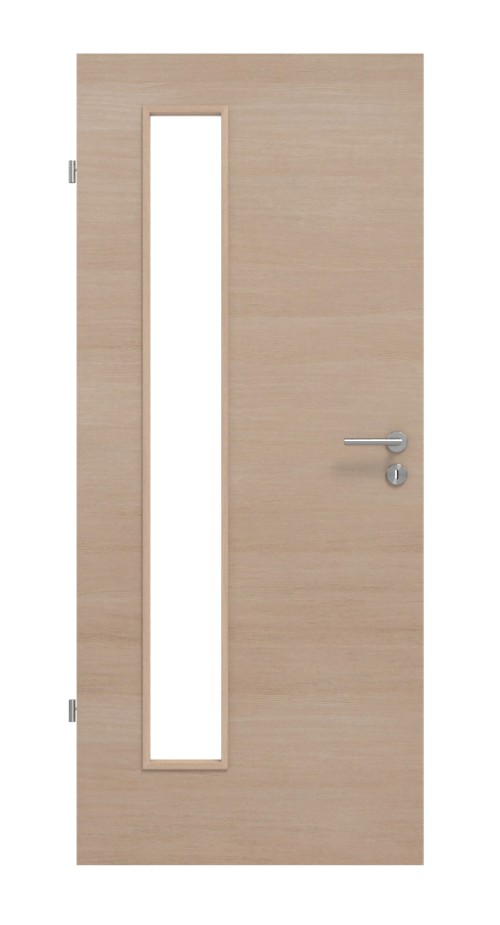 Prostokątne okno z zamontowanymi listwami wprowadza nowoczesną atmosferę. Jest wąskie i znajduje się po stronie zawiasów drzwi. Wydłużone okno na całej wysokości drzwi umożliwia widok na wydarzenia po przeciwnej stronie.