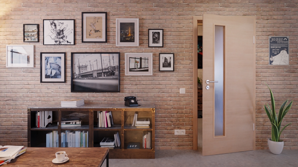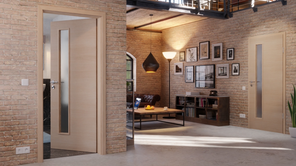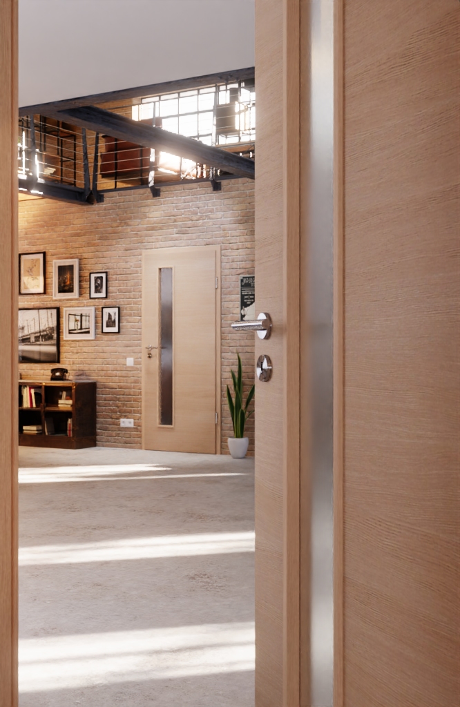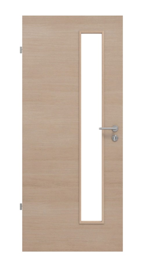 Otwór świetlny z nałożonymi listwami w kształcie prostokąta nadaje pomieszczeniu nowoczesny klimat. Jest wąski i znajduje się po stronie zamka drzwi. Dzięki wysokości umożliwia widok na drugą stronę drzwi oraz nadchodzące osoby. To przydatna funkcja w bardzo ruchliwych miejscach, takich jak biura czy kuchnie. Klamki i zamek również zyskują więcej światła.