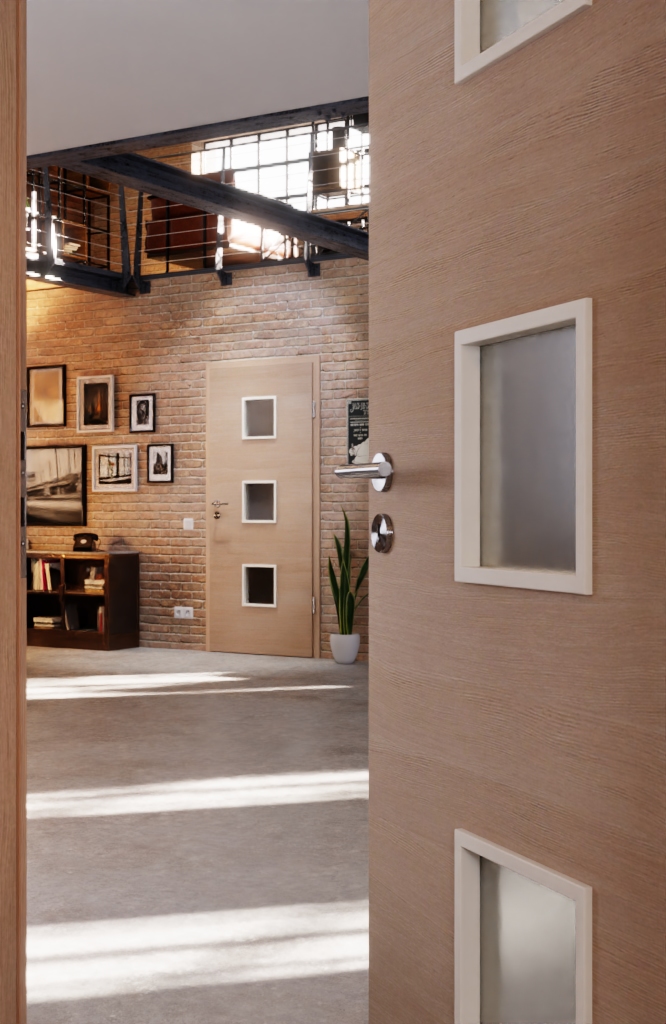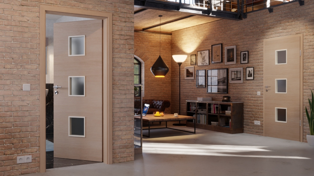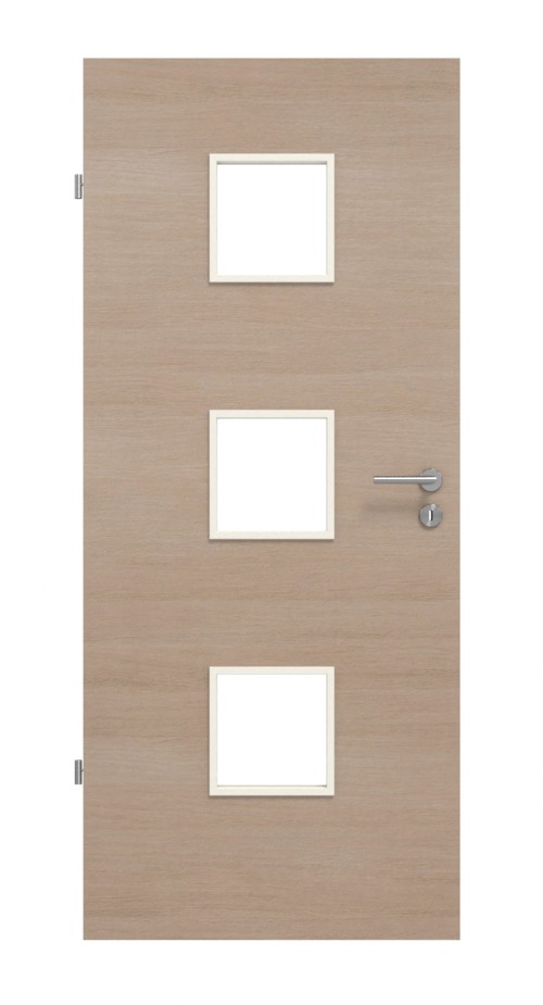 Otwór świetlny z nałożonymi listwami w kształcie prostokąta nadaje pomieszczeniu nowoczesny klimat. Trzy kwadratowe otwory świetlne w środku drzwi zachwycają wszechstronnością. Rozmieszczenie umożliwia trzy efekty: widok na zewnątrz, wystarczającą ilość światła oraz chroniony dolny obszar drzwi przed uszkodzeniami.