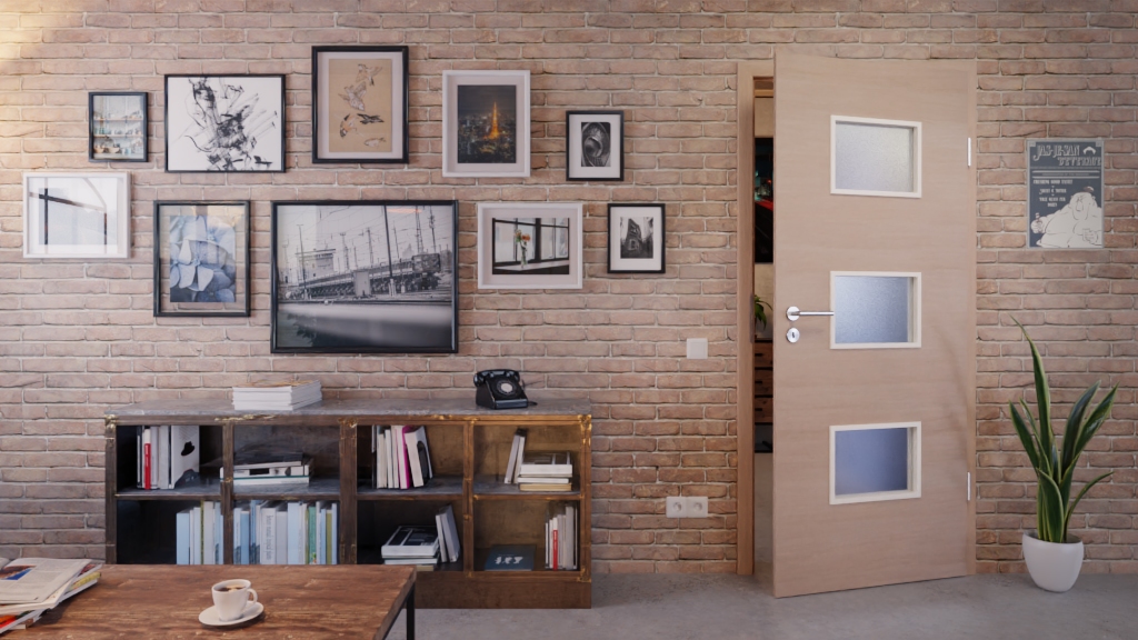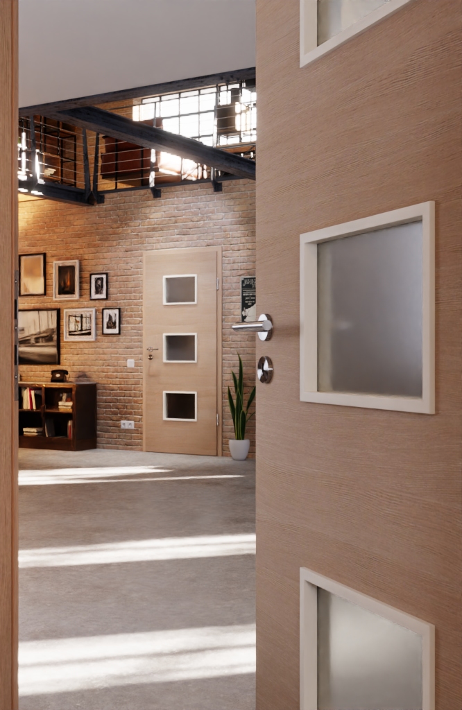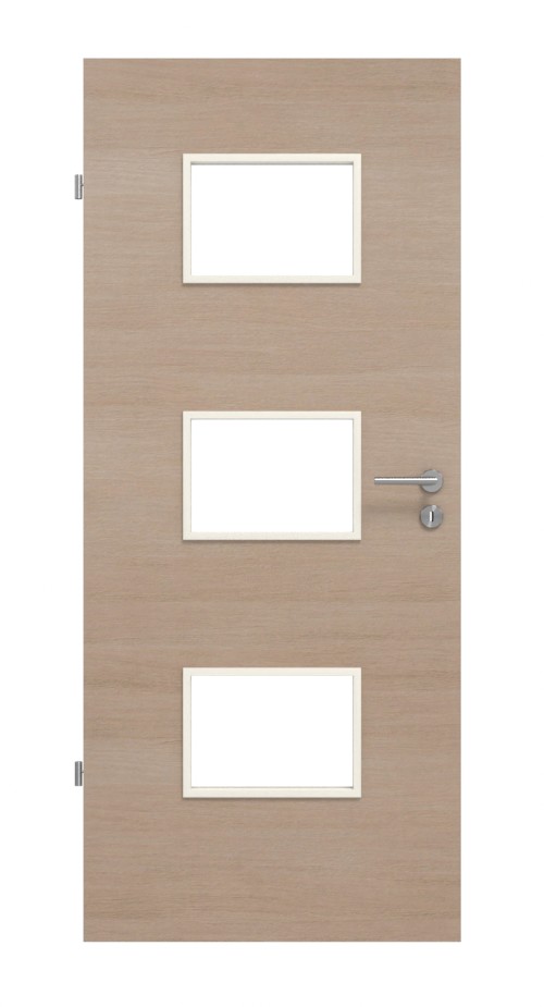 Otwór świetlny z nałożonymi listwami w kształcie prostokąta nadaje pomieszczeniu nowoczesny klimat. Oznacza to trzy prostokątne otwory świetlne ułożone jeden nad drugim w środku drzwi. Dzięki temu uzyskuje się również widok na drugą stronę drzwi, a dolna część jest chroniona przed uszkodzeniami szkła.