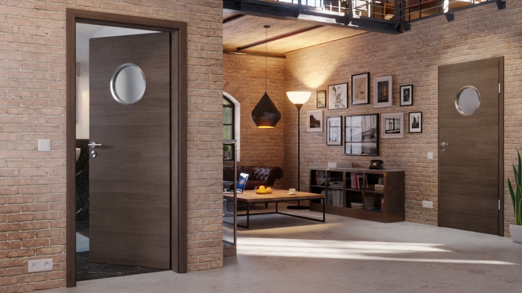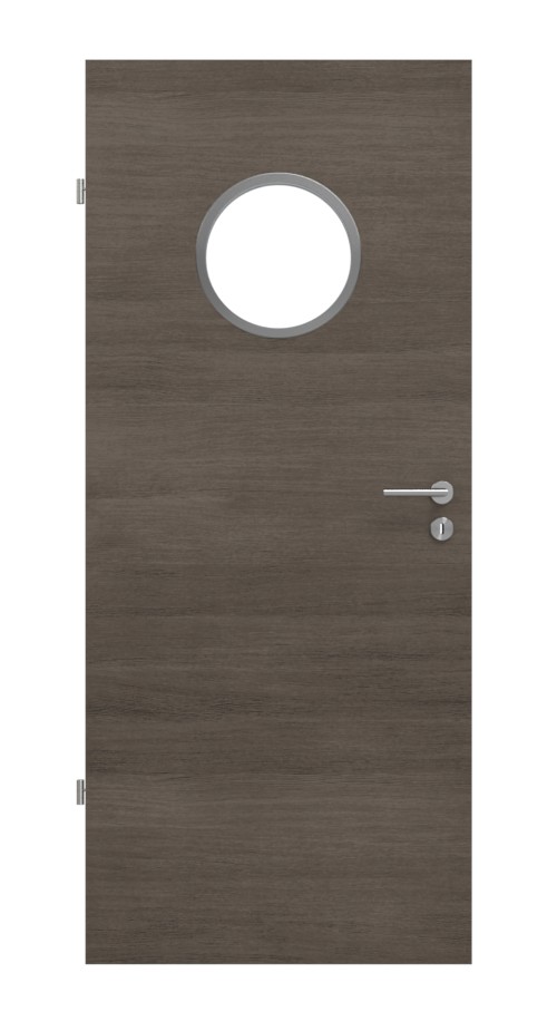 okrągły otwór świetlny w górnej części skrzydła drzwiowego