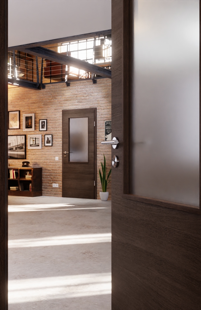 Kwadratowe przeszklenie z odpowiednimi listwami szklanymi tworzy nowoczesną atmosferę. Wizualnie oddziela drzwi. Dzięki widokowi na Twój pokój przez górną część, zapewnia świeży wygląd. Dolna część chroni drzwi przed uszkodzeniami szkła dzięki podwyższonej pozycji przeszklenia.