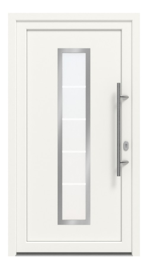 Szczególnie piękny dopływ światła umożliwia duży przeszklony wycinek w środku skrzydła drzwi dzięki czterem pasom z przezroczystego szkła na matowym tle. Prosta rama ze stali nierdzewnej nadaje specjalnie zaprojektowanemu wycinkowi nowoczesny charakter.