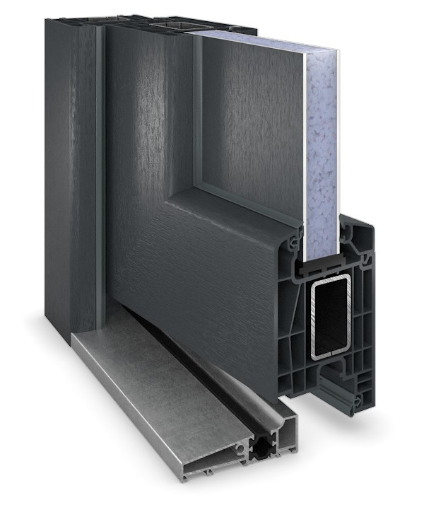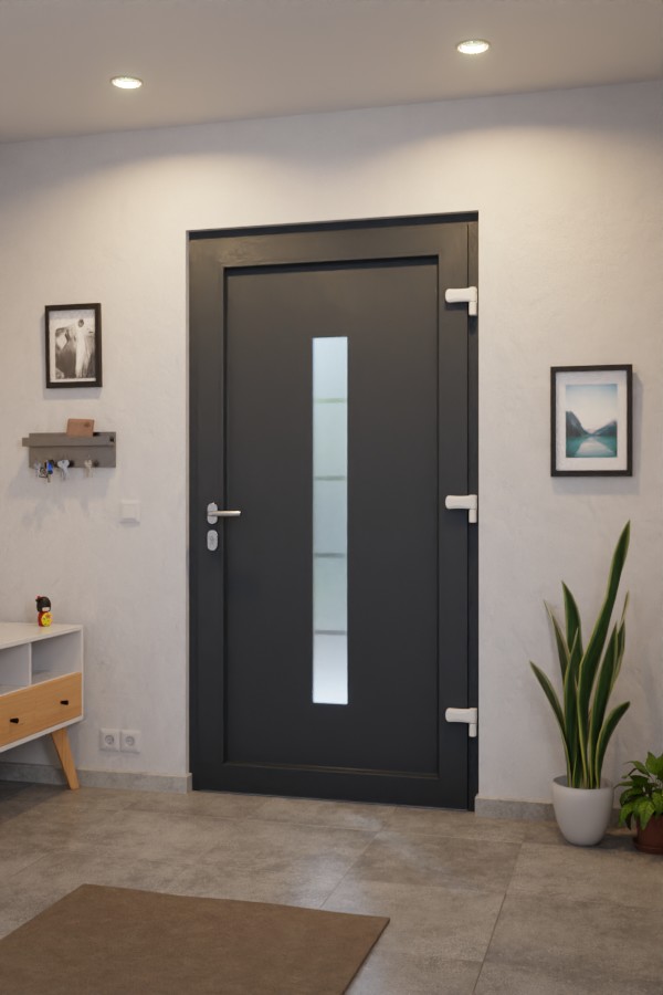 • Konstrukcja: izolowany termicznie profil wielokomorowy w ramie osłonowej i skrzydle z wyjątkowo odpornego na uderzenia PVC, skrzydło drzwiowe z wypełnieniem z tworzywa sztucznego, grubość wypełnienia: 24 mm, uszczelki obwodowe