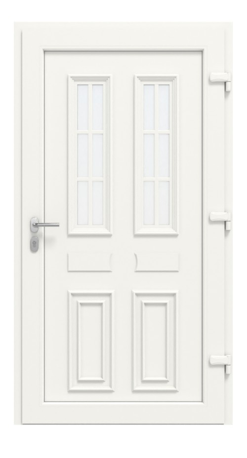 • Konstrukcja: izolowany termicznie profil wielokomorowy w ramie osłonowej i skrzydle z wyjątkowo odpornego na uderzenia PVC, skrzydło drzwiowe z wypełnieniem z tworzywa sztucznego, grubość wypełnienia: 24 mm, uszczelki obwodowe