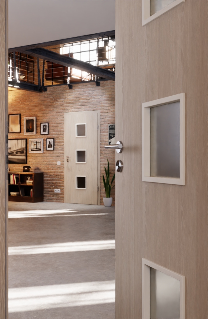 Te drzwi wewnętrzne są odporne na działanie czynników zewnętrznych, takich jak uderzenia, uszkodzenia i wilgoć, a także są odporne na zarysowania i ścieranie. Dzięki specjalnej obróbce powierzchni powstaje warstwa bez porów. Możesz wybierać spośród następujących wkładów drzwiowych: płyta wiórowa i płyta pełna.