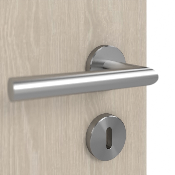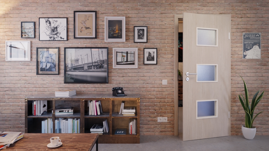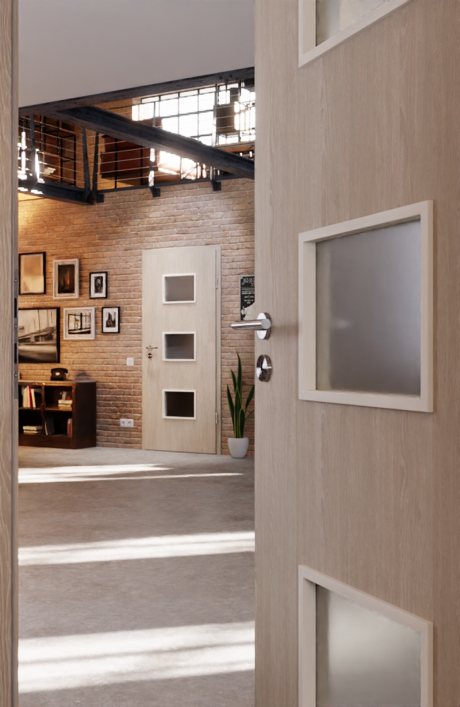 Kwadratowe otwarcie szklane z nałożonymi listwami szklanymi przyczynia się do architektonicznego klimatu. Prostokątne otwarcia szklane podkreślają symetrię w środku drzwi. Nakładające się otwory świetlne umożliwiają trzy efekty: widok na zewnątrz, wystarczającą ilość światła wewnątrz oraz chroniony dolny obszar drzwi przed uszkodzeniem szkła.