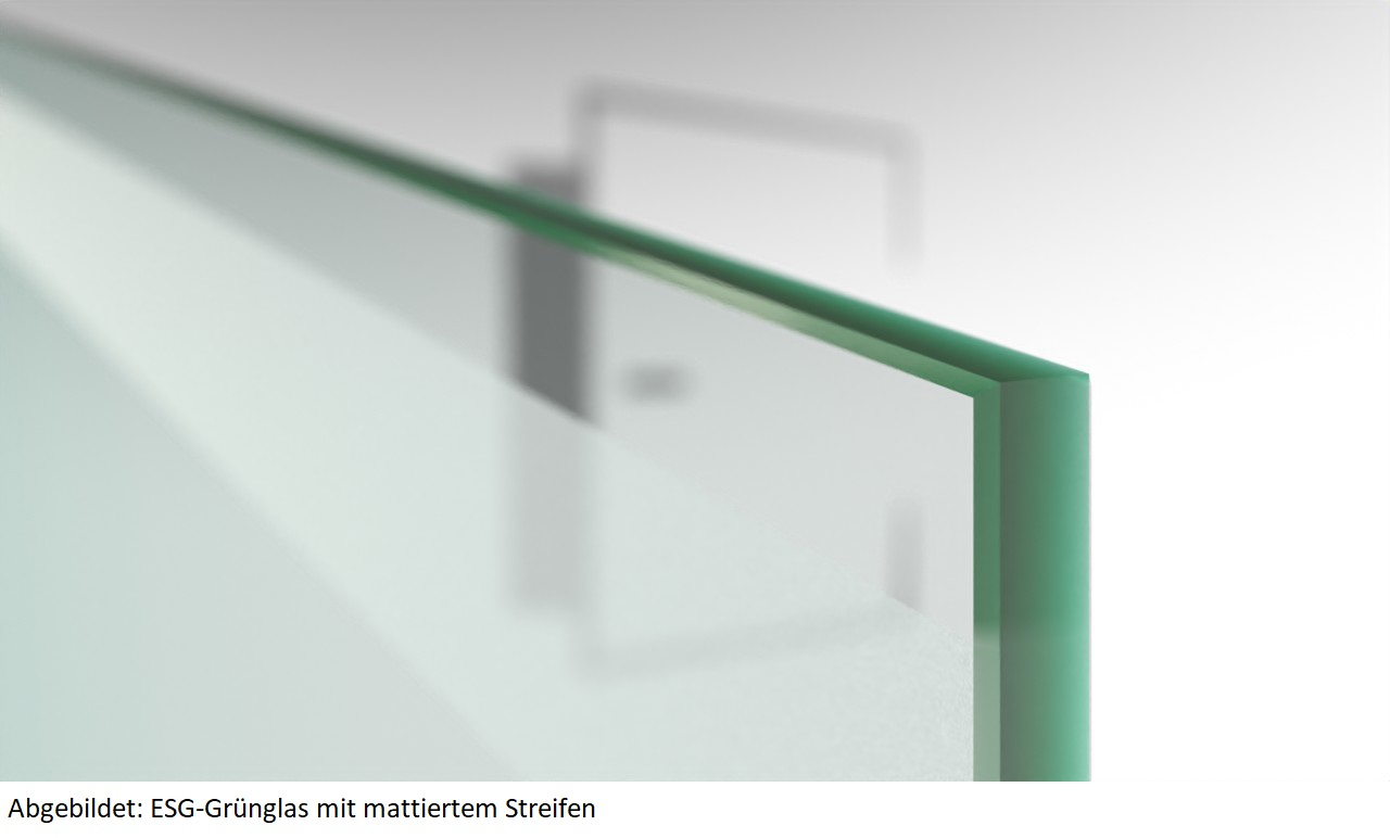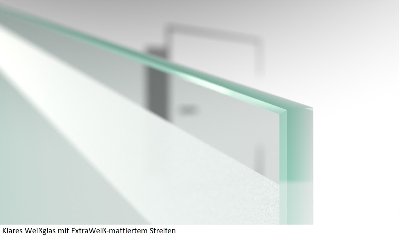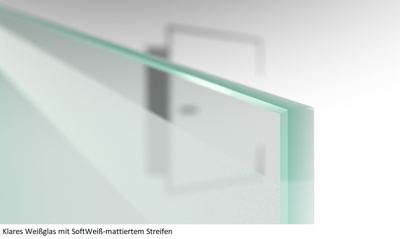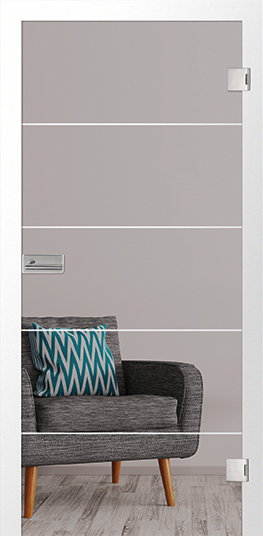 4 matowe paski o szerokości 7 mm biegną poziomo przez przezroczyste skrzydło drzwi. Ten prosty motyw zapewnia ponadczasowy design szklanych drzwi.