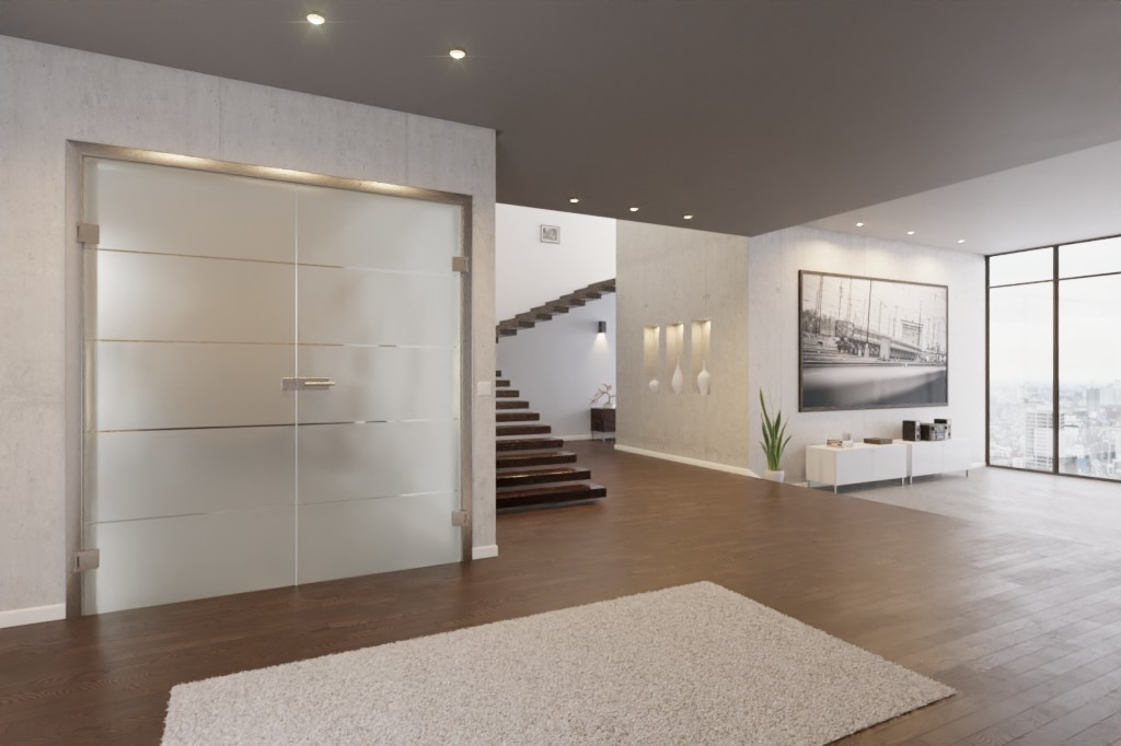 Skrzydło drzwiowe otoczone jest 4 paskami z przezroczystego szkła. Umożliwiają one harmonijne wpuszczanie światła i przyczyniają się do przyjaznej atmosfery. Paski mają szerokość 7 mm i rozciągają się w identycznych odstępach poziomo przez całe drzwi. Po każdej stronie drzwi powstaje w ten sposób 5 równych prostokątów. Prosty motyw podkreśla ponadczasowy design drzwi szklanych.