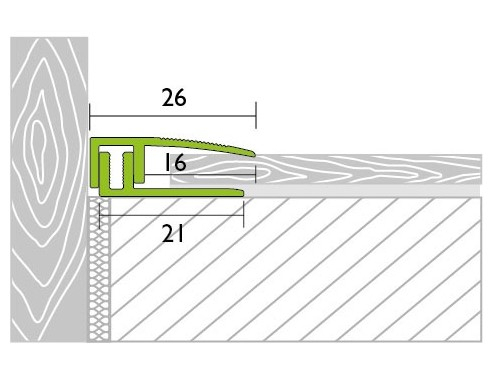 Profil idealnie amortyzuje ruchy podłogi i gwarantuje solidne trzymanie oraz perfekcyjne dopasowanie. Regulowane w wysokości i nachyleniu profil zakończeniowy posiada obrotowy przegub, co pozwala na precyzyjne dopasowanie do sąsiadujących podłóg. Dla harmonijnego zakończenia, główki śrub są niemal niewidocznie przykręcone w profilu pokrywającym.