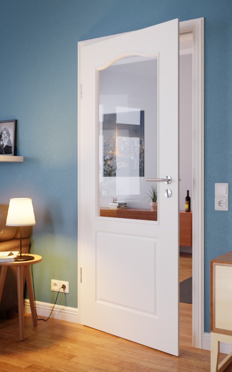 W górnej części drzwi znajduje się otwór świetlny z łukiem. Dolna część ma kwadratowe, zarysowane wypełnienie, które harmonijnie dopełnia wygląd wypełnienia. W przypadku rodzajów szkła mają Państwo wiele możliwości wyboru, od matowego do przezroczystego. Za dodatkową opłatą dostępne jest wypełnienie szklane.