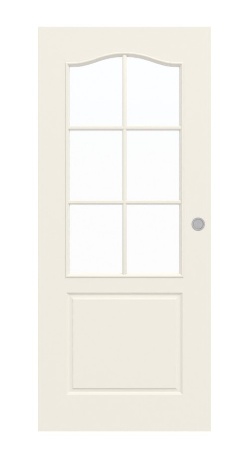 Drzwi wewnętrzne mają wygląd wypełnienia. Dolna część skrzydła wyróżnia się kwadratowym, sugerowanym wypełnieniem, a w górnej części znajduje się wydłużona przeszklenie z łukiem. Jest ono elegancko podkreślone przez poziome i pionowe listwy, które dzielą je na sześć równych kwadratów. Wydrążenie pozwala również na delikatne wpuszczenie światła do pomieszczenia. Płyta pełnoobwodowa zapewnia dodatkowo, że drzwi są bardzo stabilne.