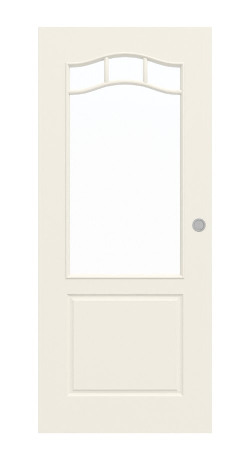 Skrzydło drzwi ma w dolnej części zarysowaną wypełnienie drewniane. Podłużne przeszklenie z łukiem dopełnia wiejski styl i wprowadza delikatne światło do Twojego pokoju. Górne sprossen umiejętnie podkreślają otwarcie na światło.