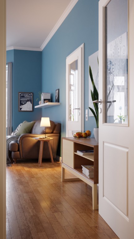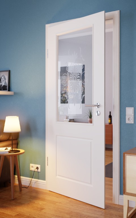 Wygląd wypełnienia drzwi przekonuje prostym wyglądem. Dolne zarysowane wypełnienie charakteryzuje się umieszczonym pośrodku kwadratem. W górnej części drzwi znajduje się prostokątny otwór świetlny. Przez nie delikatne światło wpada do Twoich pomieszczeń mieszkalnych. Przeszklenie jest ozdobione piaskowanym motywem Romantica , który nadaje pomieszczeniu romantyczny charakter.