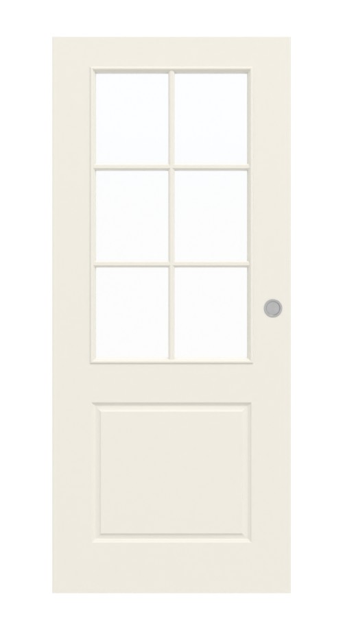 Skrzydło drzwiowe charakteryzuje się drewnianą kasetą oraz otworem świetlnym. Delikatna rama z przegrodami dzieli szybę na sześć sekcji, elegancko podkreślając styl wiejski.