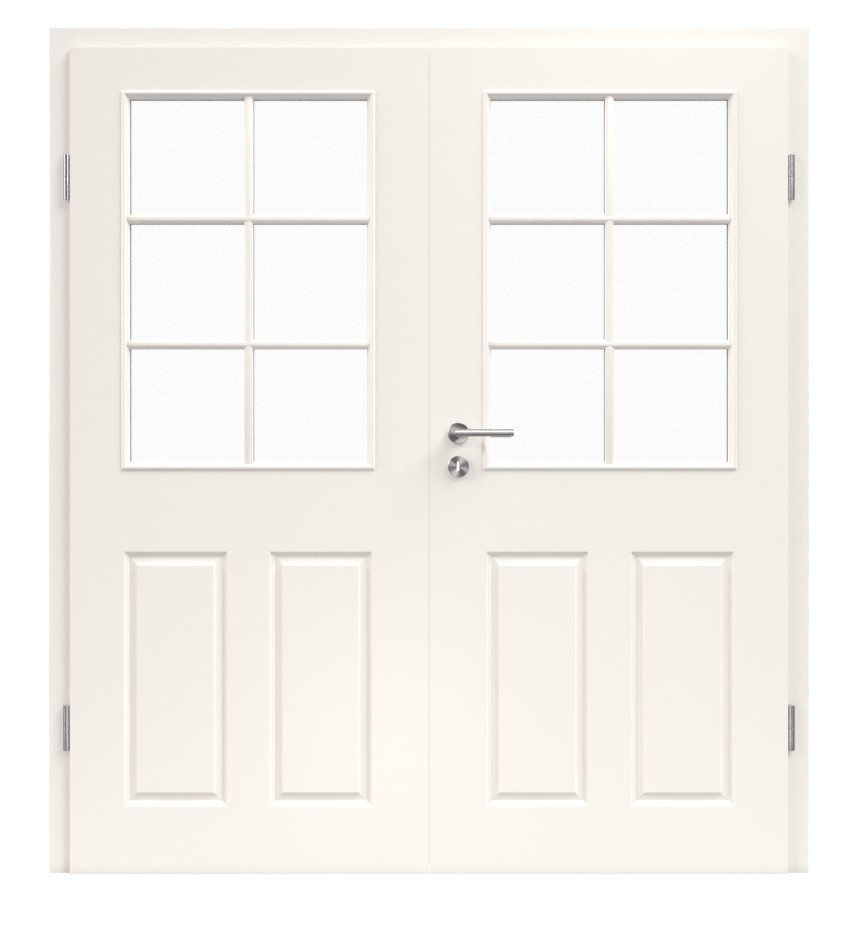 Dzięki wyglądowi wypełnienia i wyraźnym liniom, te drzwi podwójne wkomponowują się w Twoje wnętrze. W dolnej części obu skrzydeł drzwi znajdują się po dwie sugerowane wypełnienia drewniane. Na górze skrzydła drzwi umieszczono kwadratowy otwór szklany, który elegancko akcentuje trzy listwy. Dzięki otworowi uzyskasz wspaniałą grę świateł w swoim pomieszczeniu.