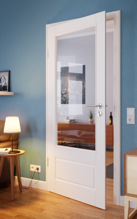 Wykrojnik szklany zajmuje górne dwie trzecie drzwi. Wygląd wypełnienia dopełnia prostokątne, sugerowane wypełnienie w dolnej części. Dzięki frezowaniom wzdłuż rogów oba elementy są sprytnie połączone i wyeksponowane. Dzięki wykrojnikowi do pomieszczenia wpada dużo światła. W przypadku rodzajów szkła masz wiele możliwości wyboru, od matowego do przezroczystego. Za dodatkową opłatą dostępne jest wypełnienie szklane.