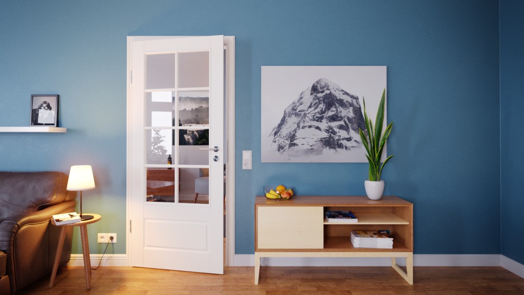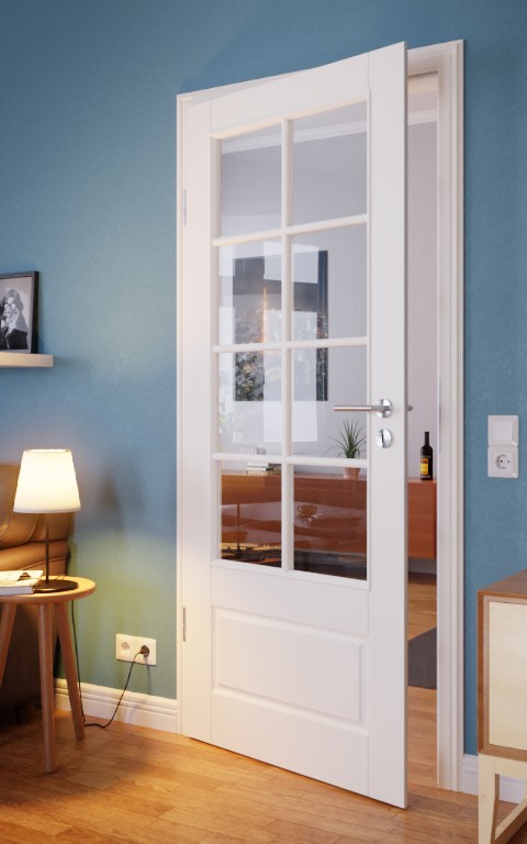 W tych drzwiach dominuje obszerny przeszklenie, które zajmuje dwie trzecie górnej części drzwi. Poziome listwy dzielą pionowe na osiem równych kwadratów. Dzięki temu otwarcie jest efektownie wyeksponowane. Dodatkowo przeszklenie wzbogaca Twoje wnętrze o czarujące światło. Wygląd wypełnienia uzupełnia prostokątne, sugerowane wypełnienie w dolnej części drzwi. Frezowania biegnące po bokach wbudowanych elementów tworzą efektowny akcent. W wykonaniach szklanych od przezroczystego do matowego znajdziesz odpowiednie dla swojego wnętrza. Wstawka szklana jest dostępna za dodatkową opłatą.