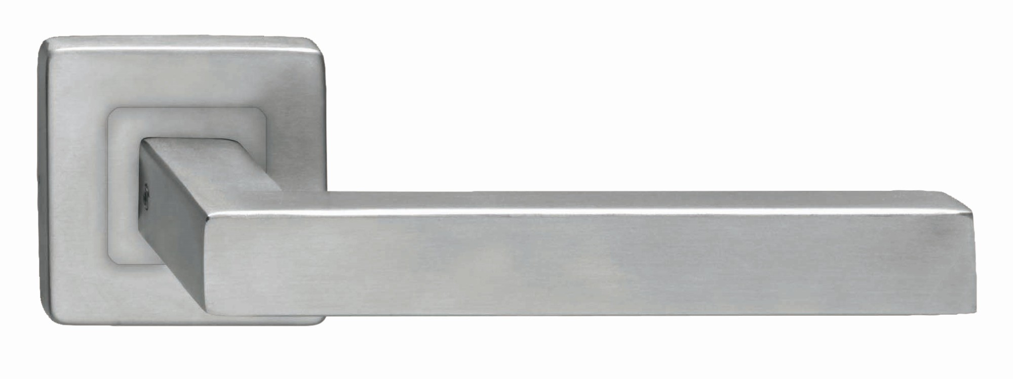 Klamka jest prostokątna i wyróżnia się wieloma krawędziami. Zasada kwadratowego uchwytu znajduje odzwierciedlenie w kwadratowych rosetkach. Jednolite grawerunki zdobią te elementy. Matowo połyskująca stal nierdzewna nie tylko wygląda dekoracyjnie, ale jest również odporna na korozję.