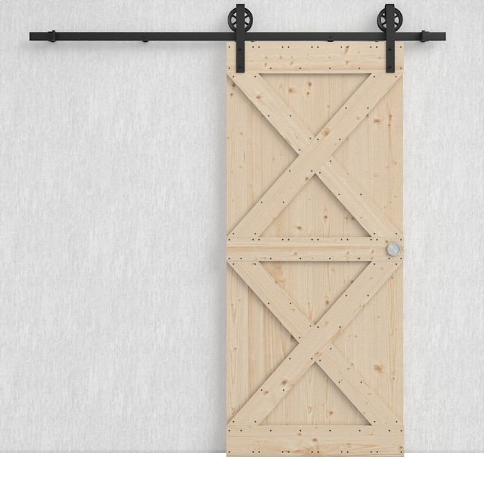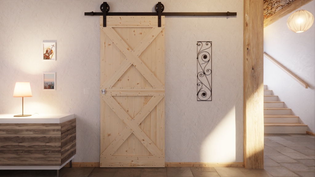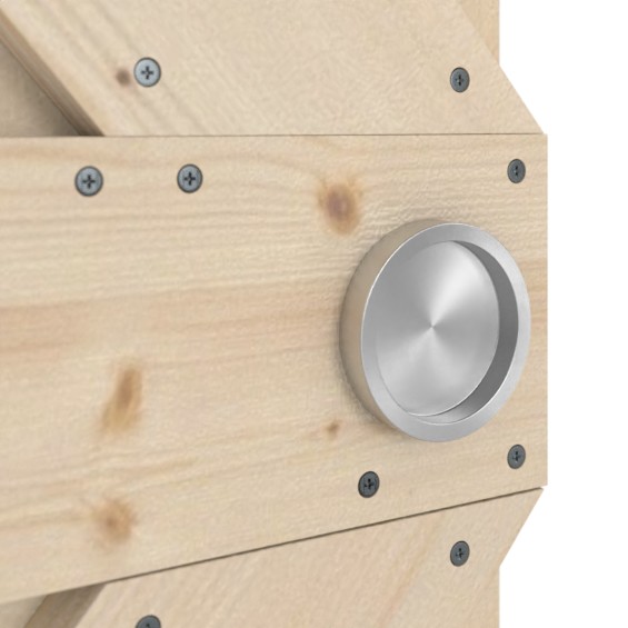 W zestawie znajduje się system montowany przy ścianie, skrzydło drzwiowe, okrągła muszla klamki oraz prowadnica podłogowa. Drzwi są wykonane z litego drewna.
