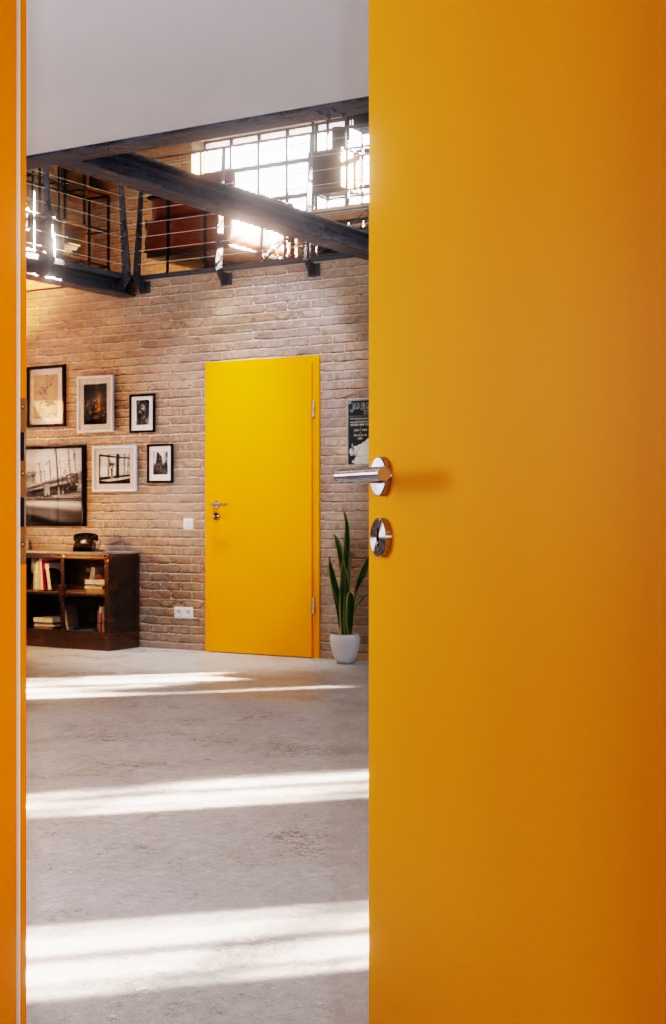 Prosty, piękny, ponadczasowy: Wygląd drzwi wewnętrznych lakierowanych w kolorze sygnalnym żółtym od producenta jakościowego Lebo jest prosty i subtelny.