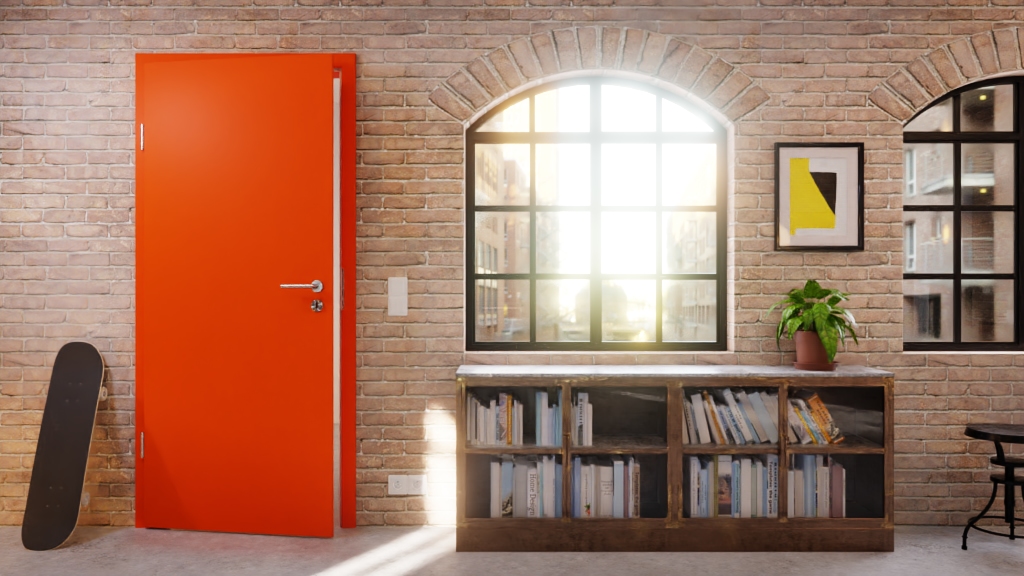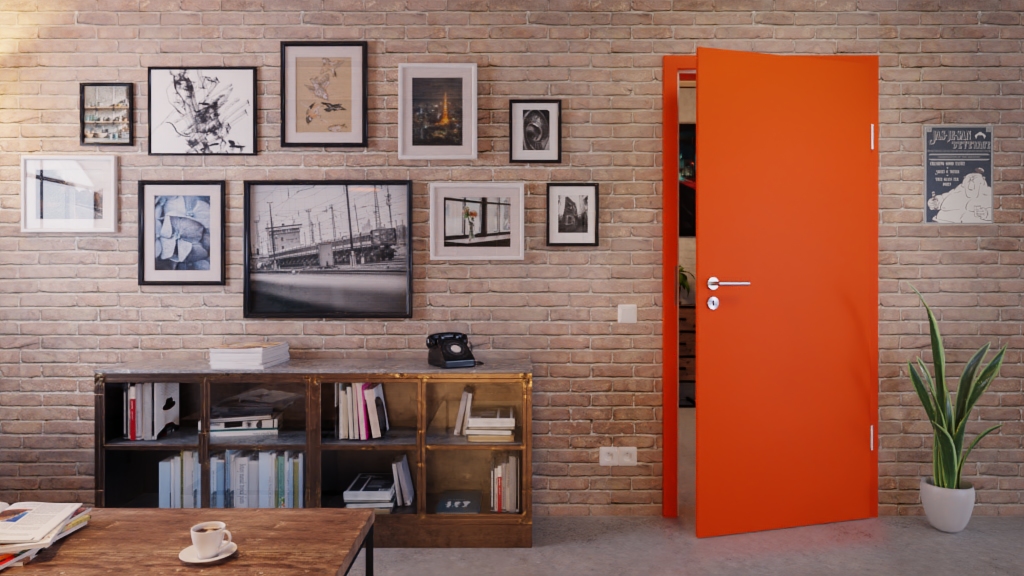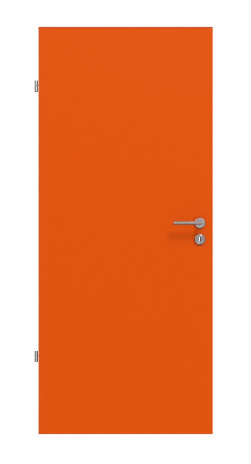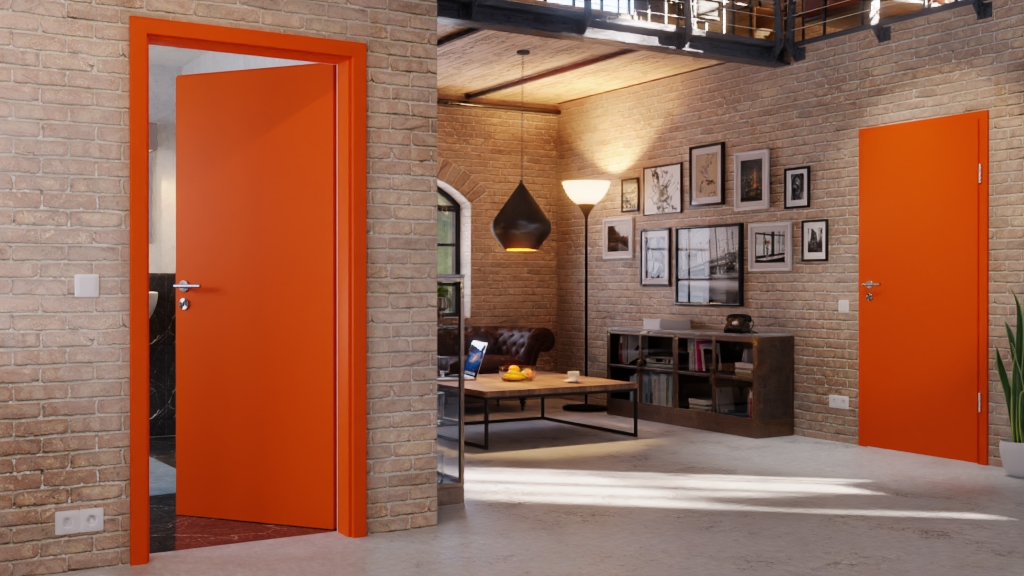 Proste akcenty kolorystyczne: Stonowane, gładkie drzwi wewnętrzne od Lebo zachwycają prostotą i intensywną kolorystyką w czystej pomarańczy.