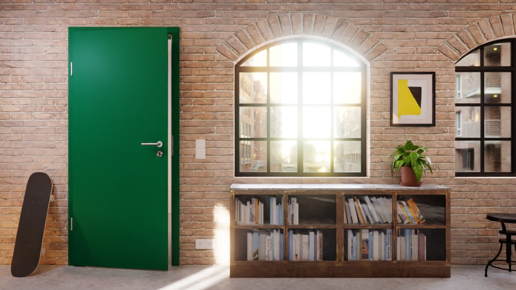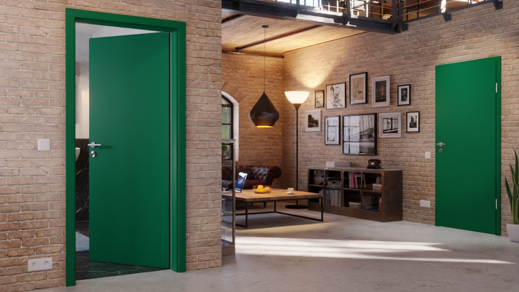 • Gładkie drzwi wewnętrzne w kolorze zielony turkusowy od markowego producenta Lebo
