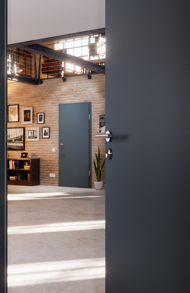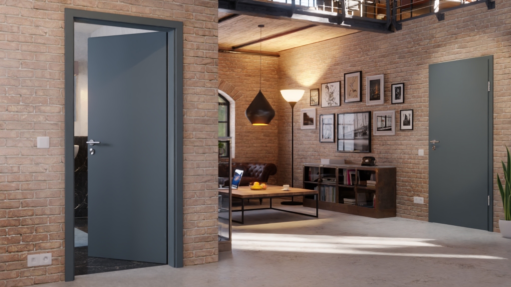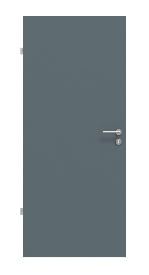 Prostota, która zachwyca: Prosta, gładka drzwi w niebieskoszarym kolorze od Lebo zachwyca swoją wysoką jakością wykonania.