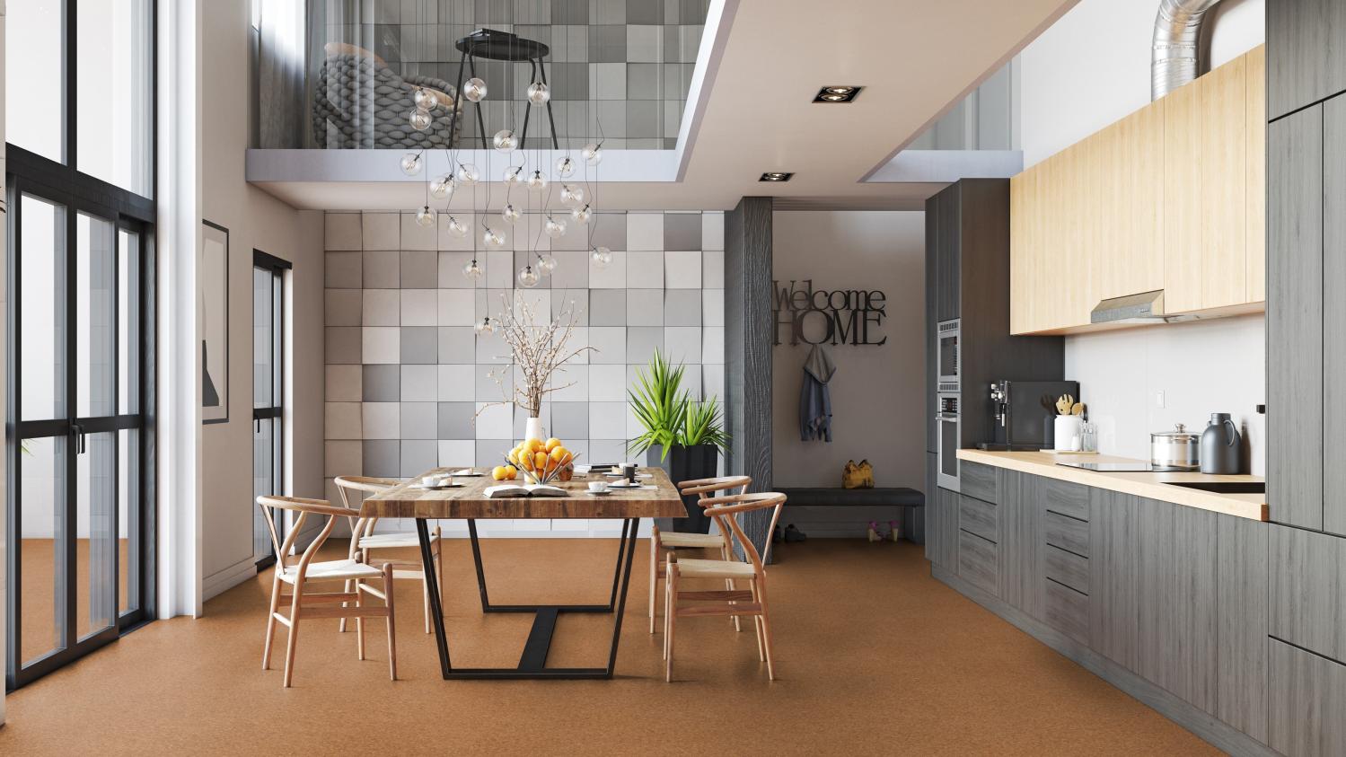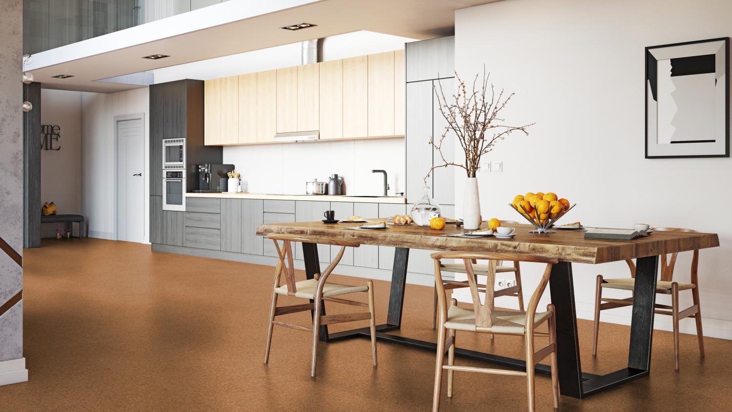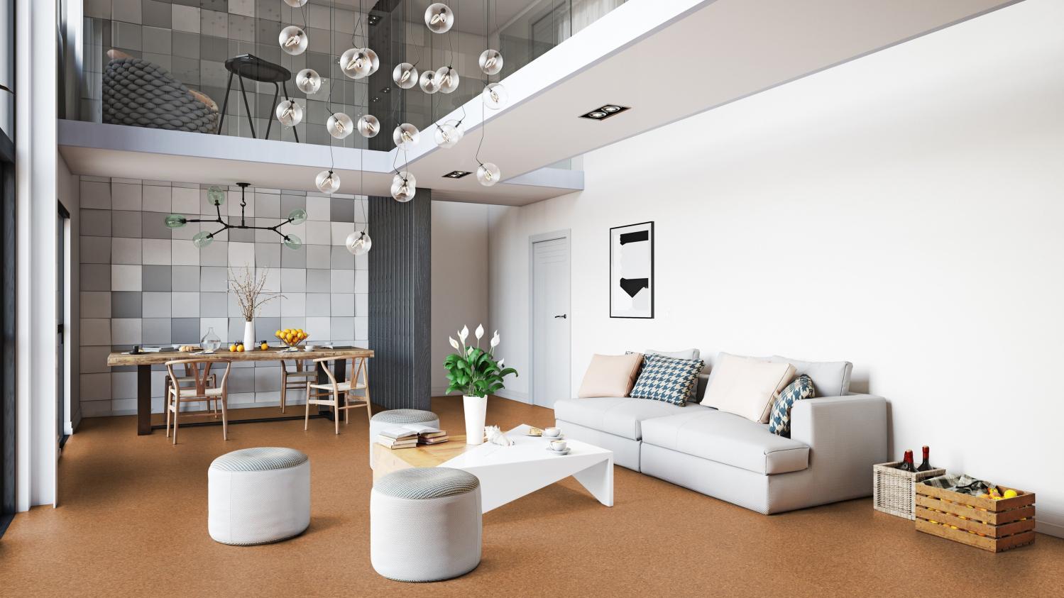 Naturalne mieszkanie z komfortem: Podłoga Rhapsody Natural z serii Cork Pure firmy Wicanders w kolorze brązowym wprowadza spokój i ciepło do pomieszczeń mieszkalnych.