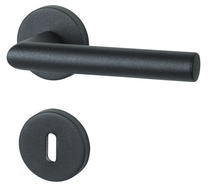 Okrągłe rozetki i prosty cylindryczny uchwyt wyglądają dzięki wykończeniu w czarnym stali szczególnie elegancko i ponadczasowo. Zintegrowana sprężyna podtrzymująca zapewnia trwałe poziome ustawienie uchwytu.