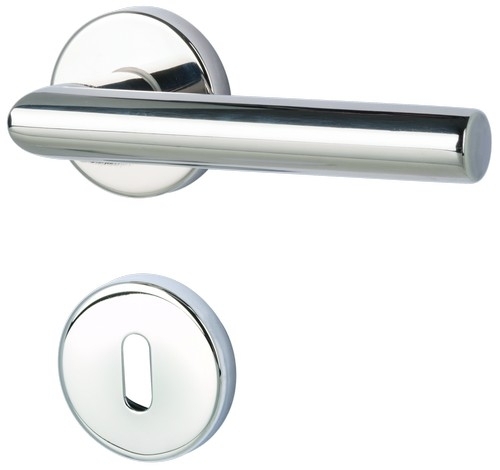 Polerowane powierzchnie ze stali nierdzewnej nadają zestawowi elegancki wygląd. Zestaw z okrągłymi rozetkami i cylindrycznym uchwytem jest przetestowany pod kątem ochrony przeciwpożarowej. Trwała pozioma pozycja przycisku jest zapewniona przez wbudowaną sprężynę podtrzymującą.
