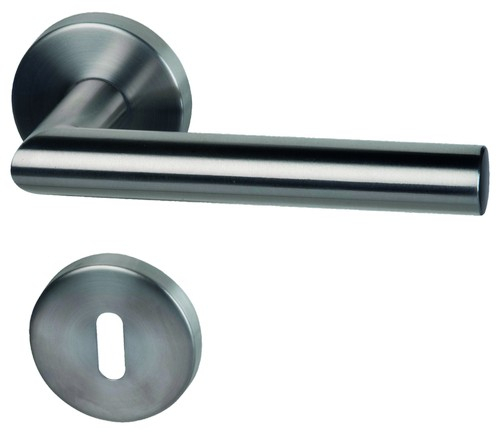 Model wykonany jest z matowego stali nierdzewnej. Po wewnętrznej stronie znajduje się prosty, L-kształtny uchwyt na okrągłej rozetce. Na zewnątrz znajduje się płaski, okrągły przycisk. Dzięki sprężynie podtrzymującej wewnątrz zapewniona jest trwała pozioma pozycja uchwytu.