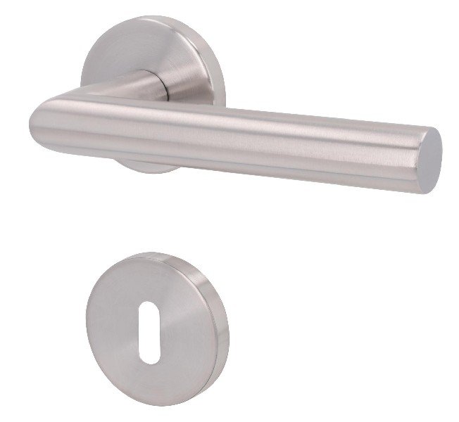 Dzięki matowej powierzchni ze stali nierdzewnej okrągłe rozetki i cylindryczny uchwyt wyglądają prosto i elegancko. Wbudowana sprężyna powrotna niezawodnie przywraca klamkę do pozycji wyjściowej.