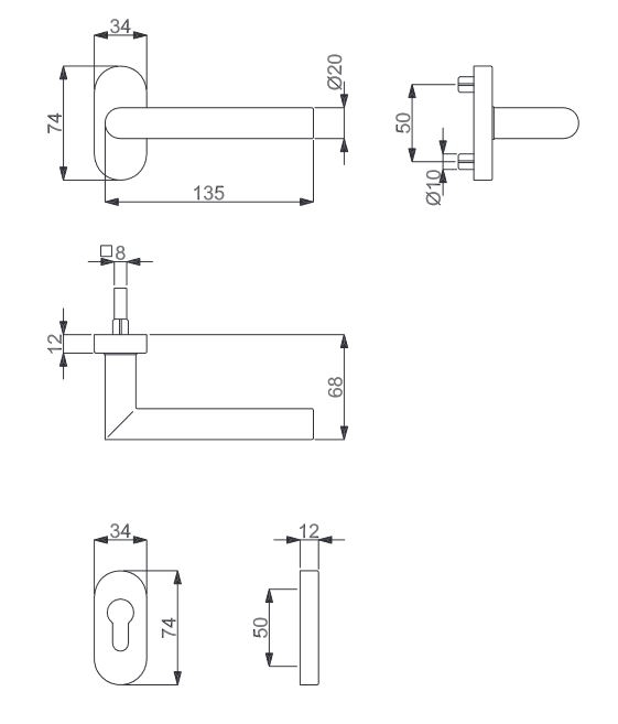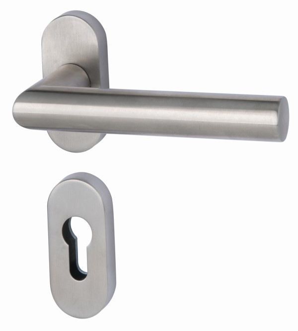 Dzięki wąskim owalnym rozetom i prostemu uchwytowi w kształcie cylindra, zestaw drzwiowy ze stali nierdzewnej wygląda prosto i nowocześnie. Trwała pozioma pozycja klamki jest zapewniona przez wbudowaną sprężynę podtrzymującą.