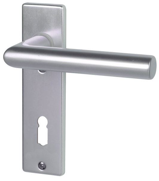 Na widocznie przykręconym, prostokątnym krótkim szyldzie znajduje się subtelny uchwyt drzwiowy w kształcie cylindra. satinowane aluminium wygląda jasno i przyjaźnie.