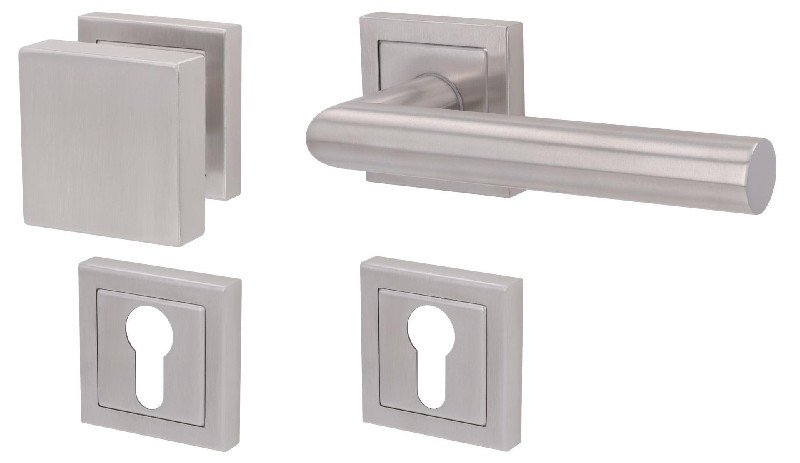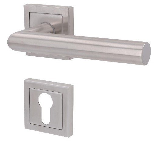 Kwadratowe rozetki matowej stali nierdzewnej zdobią delikatne rowki. Model przeszedł testy odporności na ogień. Wbudowana sprężyna powrotna niezawodnie przywraca klamkę do poziomej pozycji.