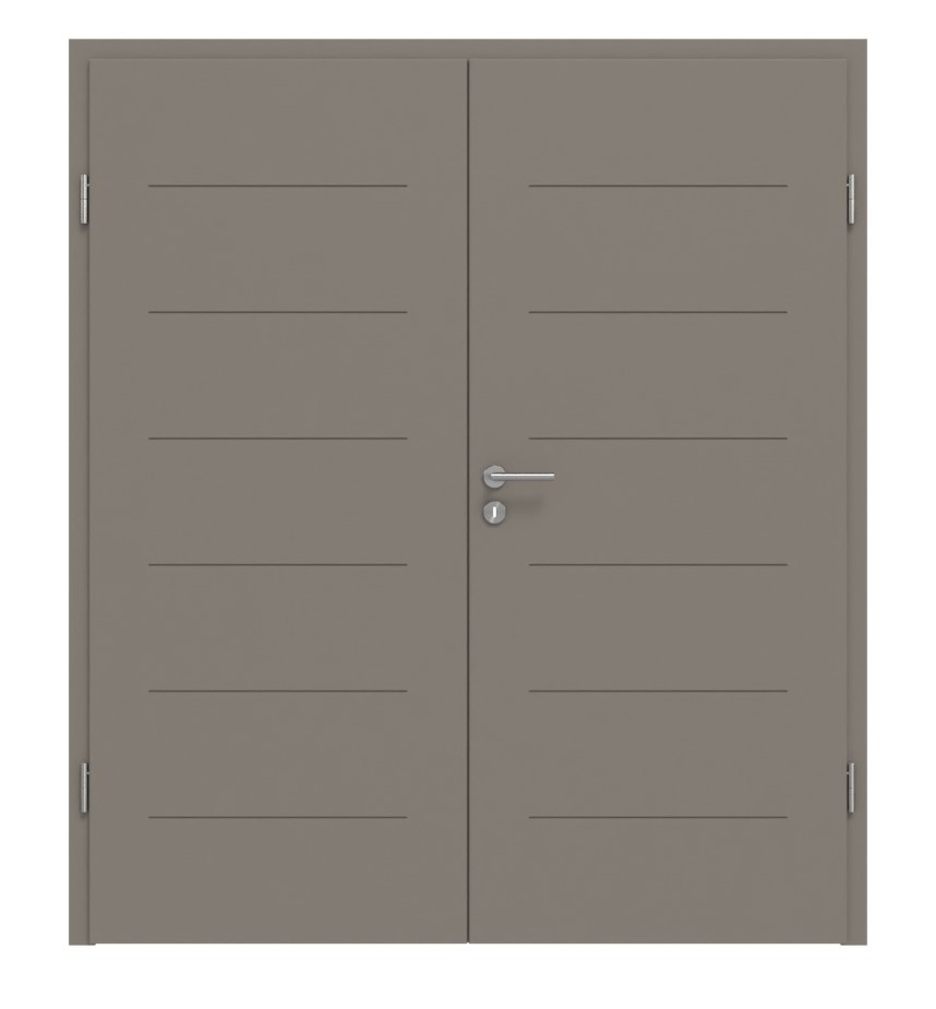 Przez każde skrzydło drzwiowe przebiega sześć wyfrezowanych fug. Nowoczesny wzór wygląda jeszcze bardziej elegancko dzięki wysokiej jakości lakierowaniu w kolorze taupe (ciemnoszaro-brązowy).