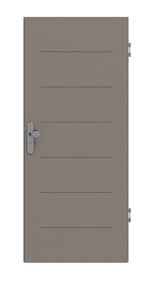 Na skrzydle drzwiowym znajduje się sześć wyfrezowanych fug. Nowoczesny wzór wygląda jeszcze bardziej elegancko dzięki wysokiej jakości lakierowaniu w kolorze taupe (ciemnoszaro-brązowy).