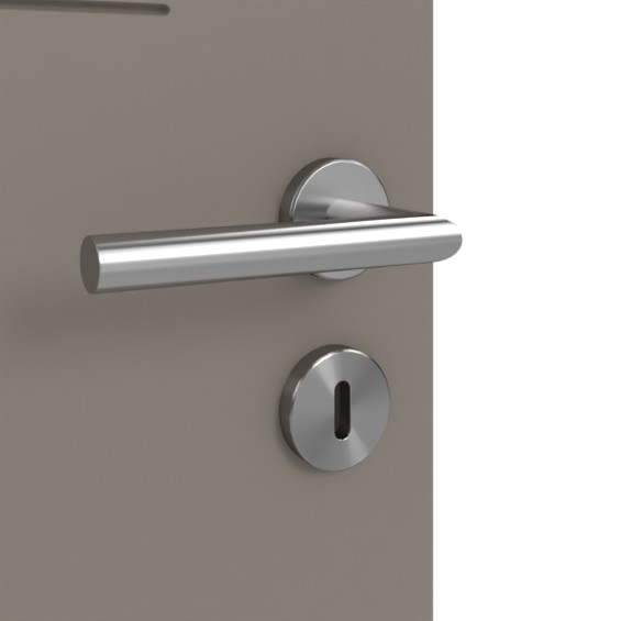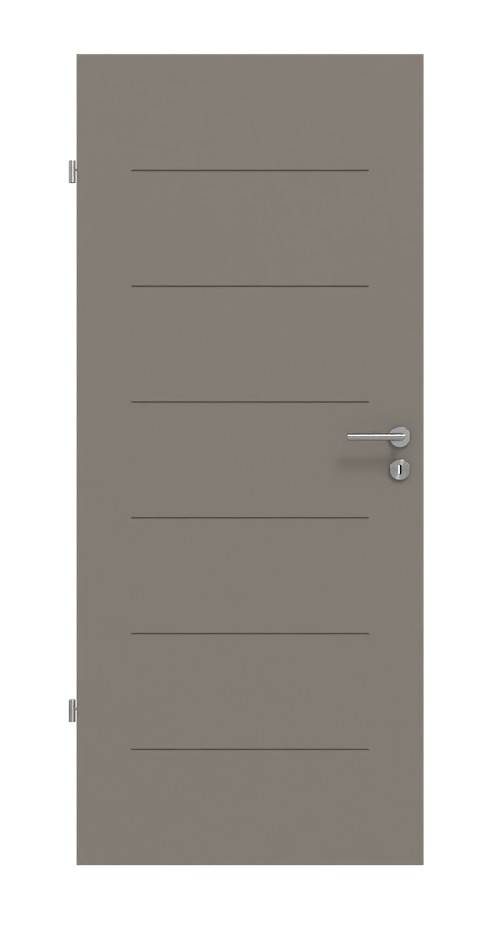 Na skrzydle drzwiowym znajduje się sześć wyfrezowanych fug. Nowoczesny wzór wygląda jeszcze bardziej elegancko dzięki wysokiej jakości lakierowaniu w kolorze taupe (ciemnoszaro-brązowy).