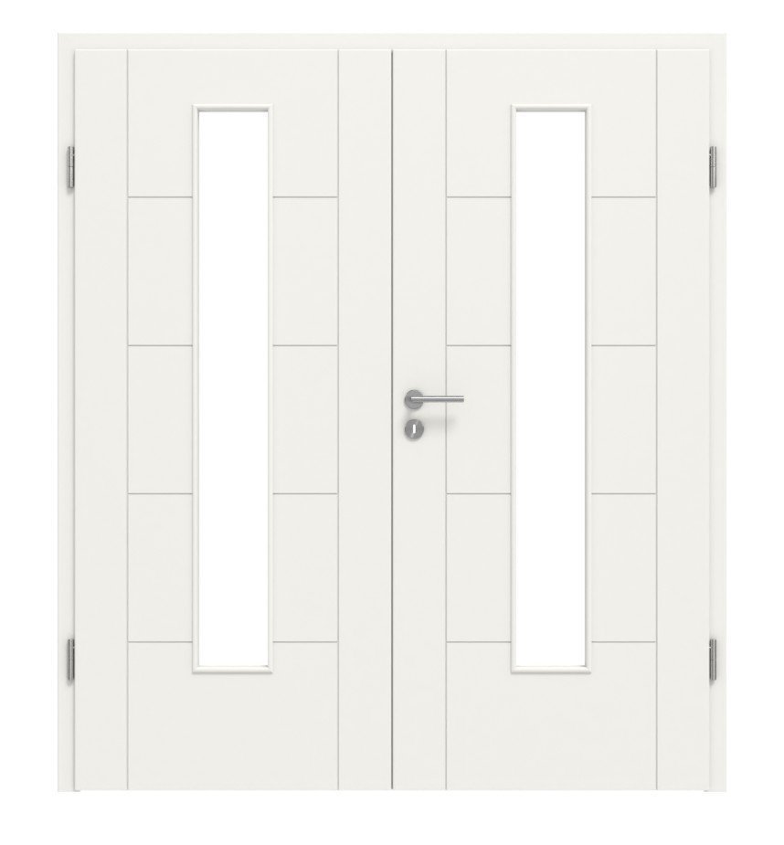 Stylowy model drzwi podwójnych w białym lakierze o łatwych w pielęgnacji właściwościach: