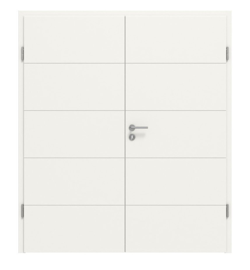 Po krawędzi biegną poziome linie na skrzydłach drzwi. Dzięki białej lakierowanej powierzchni powstaje prosta konstrukcja drzwi, która doskonale pasuje do każdego wnętrza.