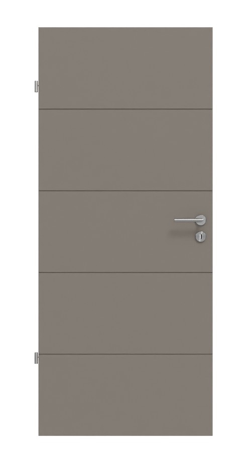 Na skrzydle drzwiowym wyfrezowano cztery poziome szczeliny. Biegną one aż do krawędzi skrzydła drzwiowego. Dzięki szarobrązowej powierzchni lakierowanej model ten pasuje do każdego wystroju wnętrza.