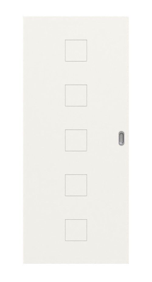 Na skrzydle drzwi wyfrezowano pięć małych kwadratów. Połączenie geometrycznego wzoru i szlachetnego białego lakieru tworzy gustowny wygląd z indywidualnym akcentem.
