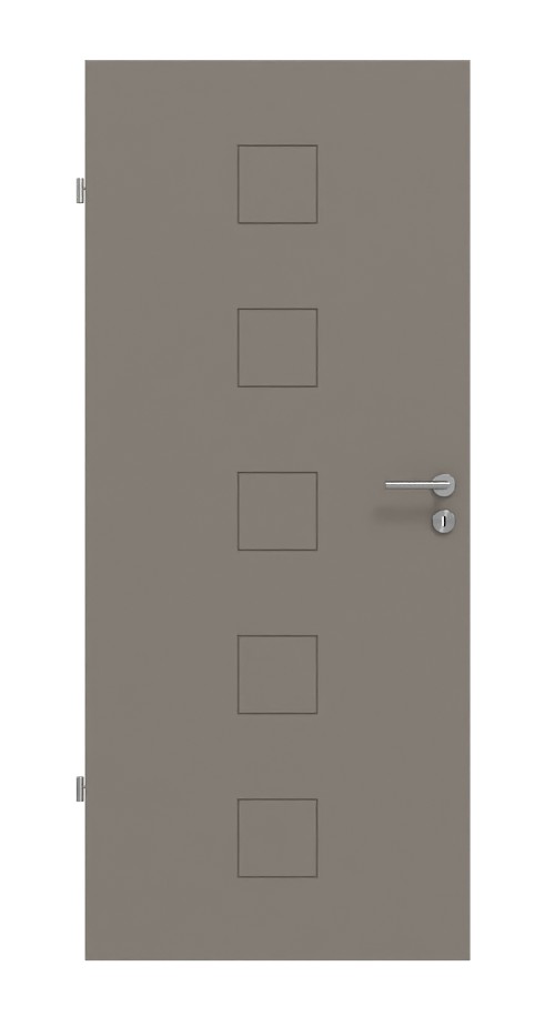 Dzięki wyfrezowanym fugom na skrzydle drzwiowym widocznych jest pięć małych kwadratów. Dzięki wysokiej jakości lakierowi w kolorze szarobrązowym uzyskano proste i gustowne wykończenie wizualne, które pasuje do każdego stylu wnętrza.