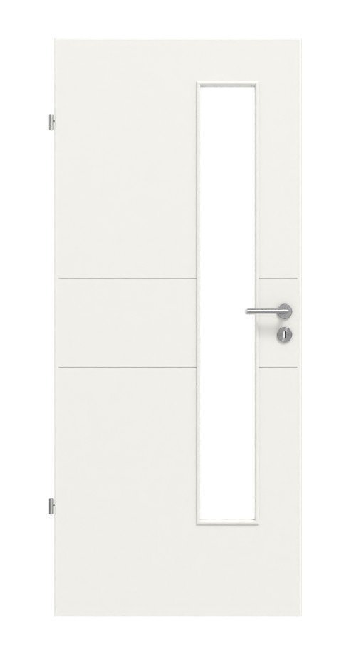 Dwie poziome spoiny, biegnące w pobliżu zamka na całej szerokości drzwi, dzielą skrzydło drzwiowe na trzy części. Elegancki, geometryczny wzór podkreślony jest przez wysokiej jakości białą powłokę lakierniczą . Dzięki szklanemu wycięciu po stronie zamka do Twojego domu wpada dużo światła.