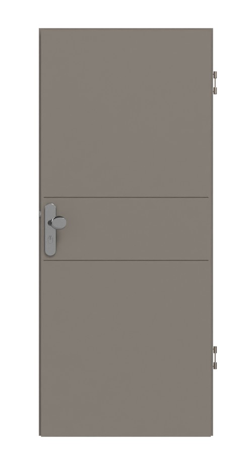 Dzięki szarobrązowej kolorystyce drzwi zyskują gustowne, naturalne wykończenie wizualne, które pasuje do każdego wnętrza. Dwie poziome szczeliny dzielą skrzydło drzwiowe na trzy prostokątne segmenty.