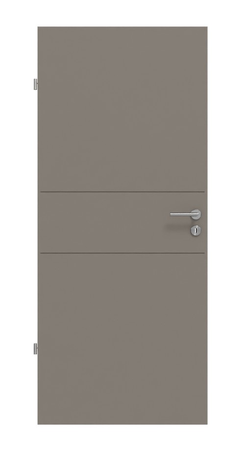 Dzięki szaro-brązowemu wykończeniu uzyskuje się gustowny, naturalny wygląd, który pasuje do każdego wnętrza. Dwie poziome szczeliny dzielą skrzydło drzwi na trzy prostokątne segmenty.